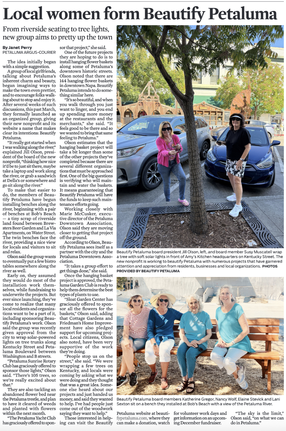 “As a member of this incredible group of women, I am truly inspired by our collective vision to enhance the beauty of our historic town. The hanging flower baskets project is just the beginning of our journey towards creating a more charming and vibrant community. Together, we are committed to making a positive impact through small-scale beautification projects that celebrate our town’s unique character and natural beauty. I am excited to see how our efforts will transform public spaces and foster a sense of pride among residents and visitors alike.” – Jill Olson, Beautify Petaluma President